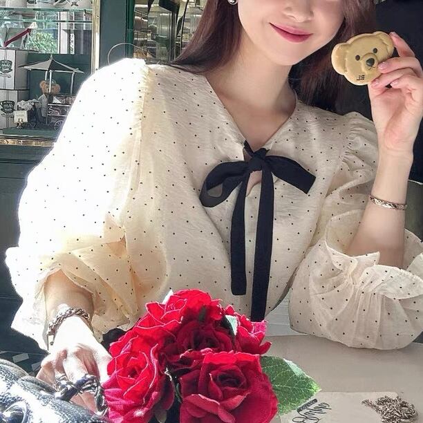 シアーなボリュームスリーブとレーススカートのコンビがエレガントなトップス。