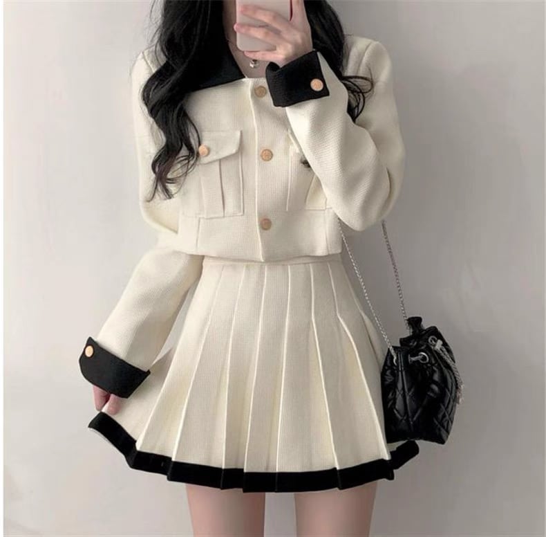 フレンチプレッピースタイル 配色ショートジャケット+ハイウエストプリーツスカート 2点セット PA00130