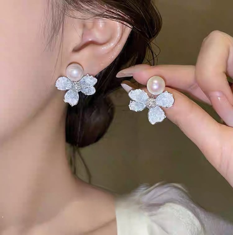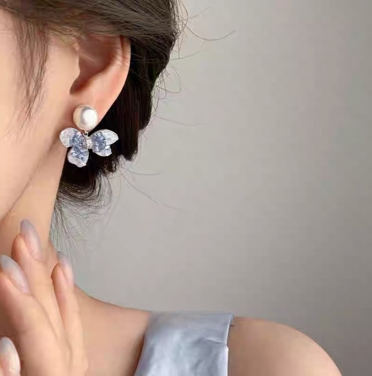 パールの上に舞い降りた透明蝶が、優雅に揺れる幻想的なピアス。