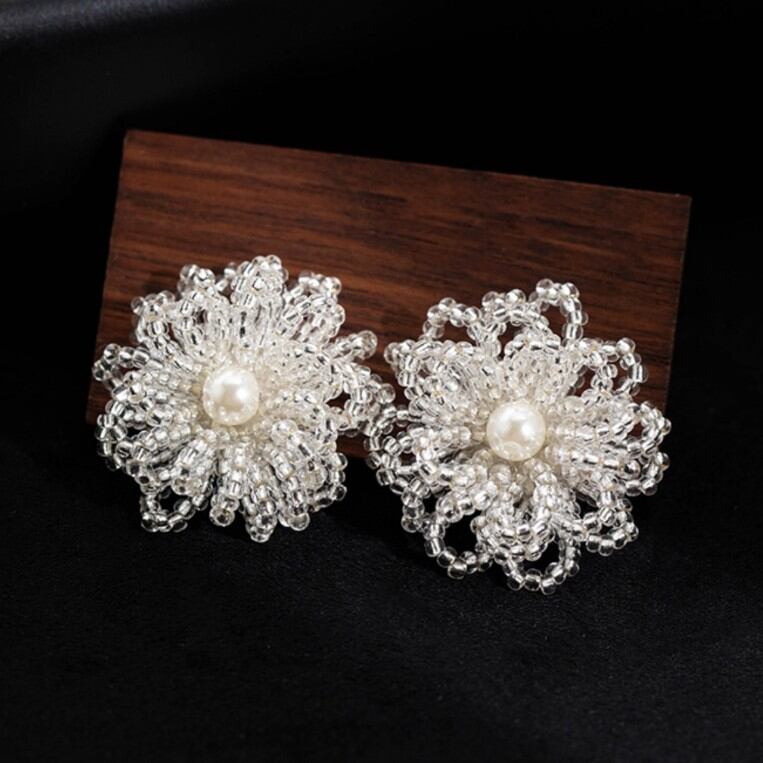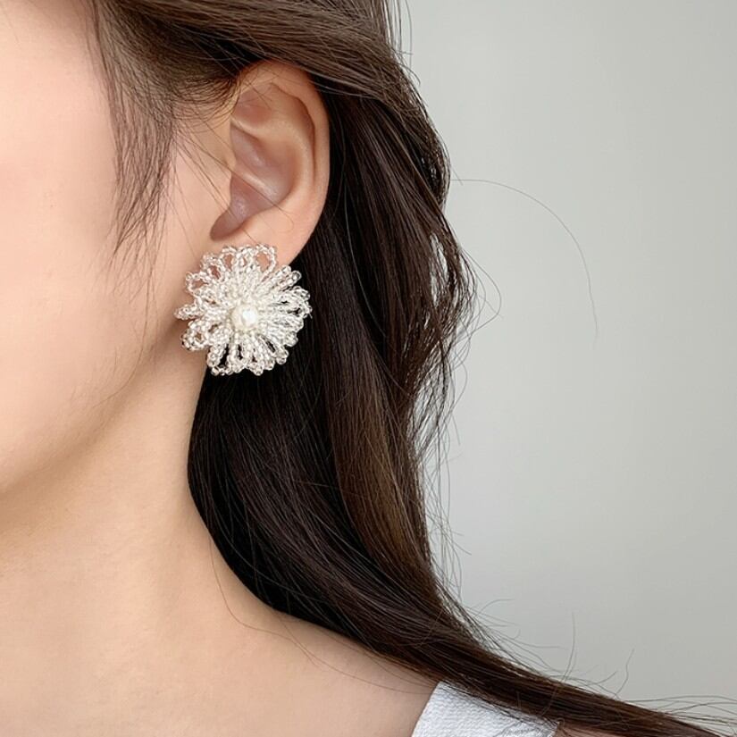 レースのように繊細なビーズの花に、中心のパールがきらりと光る、大人ガーリーな一品。