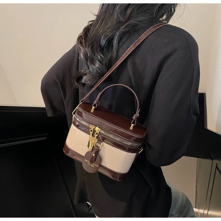 ブラウンとベージュのバイカラーが大人っぽいボックス型ミニバッグ。