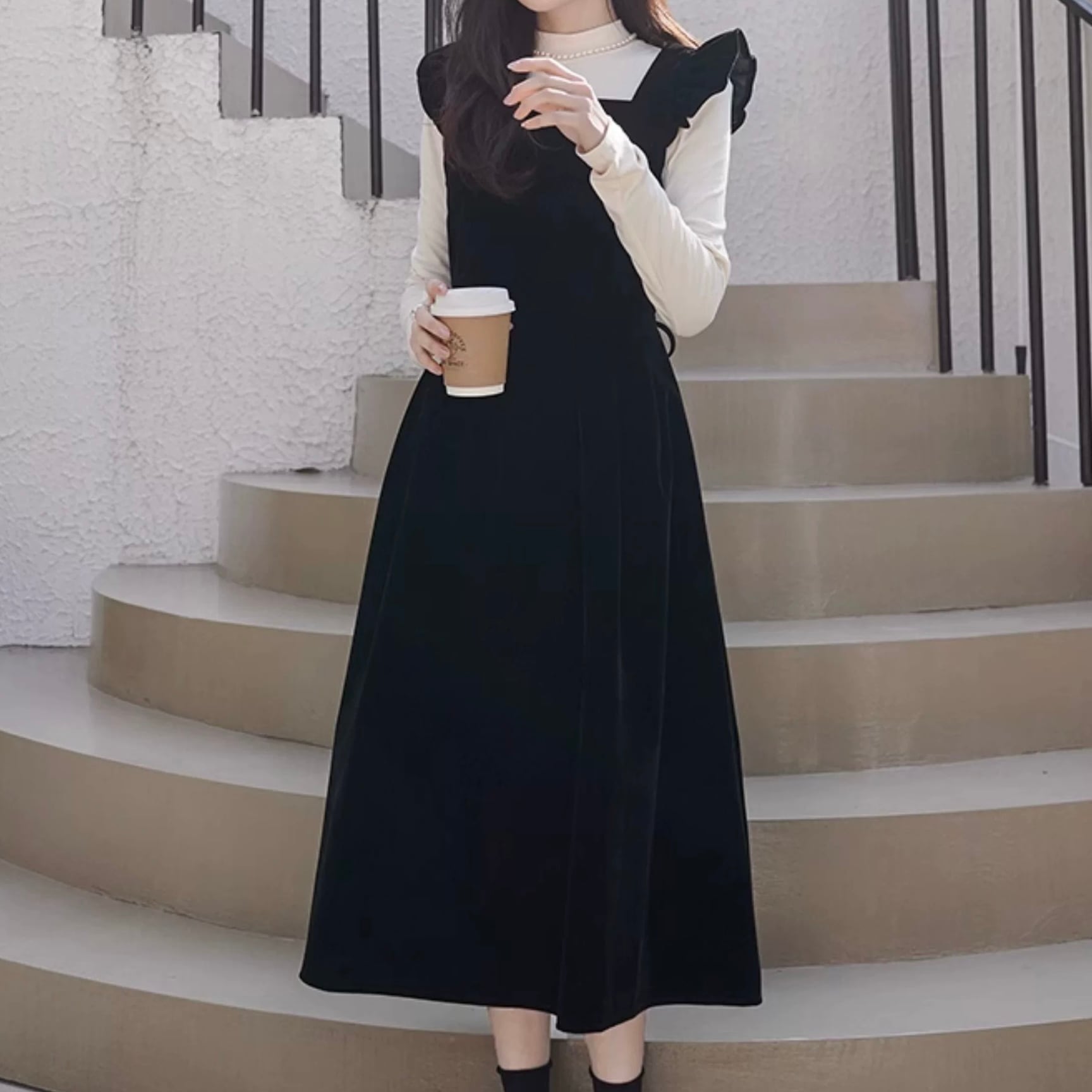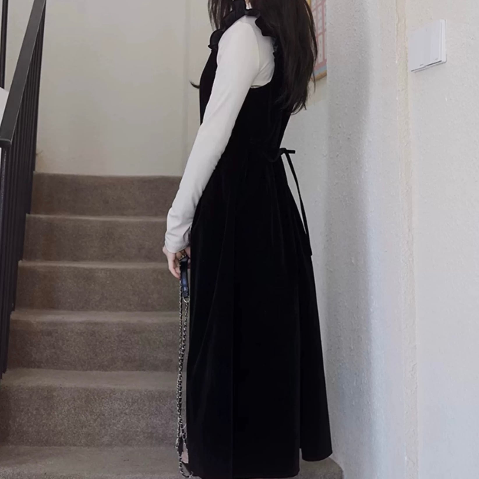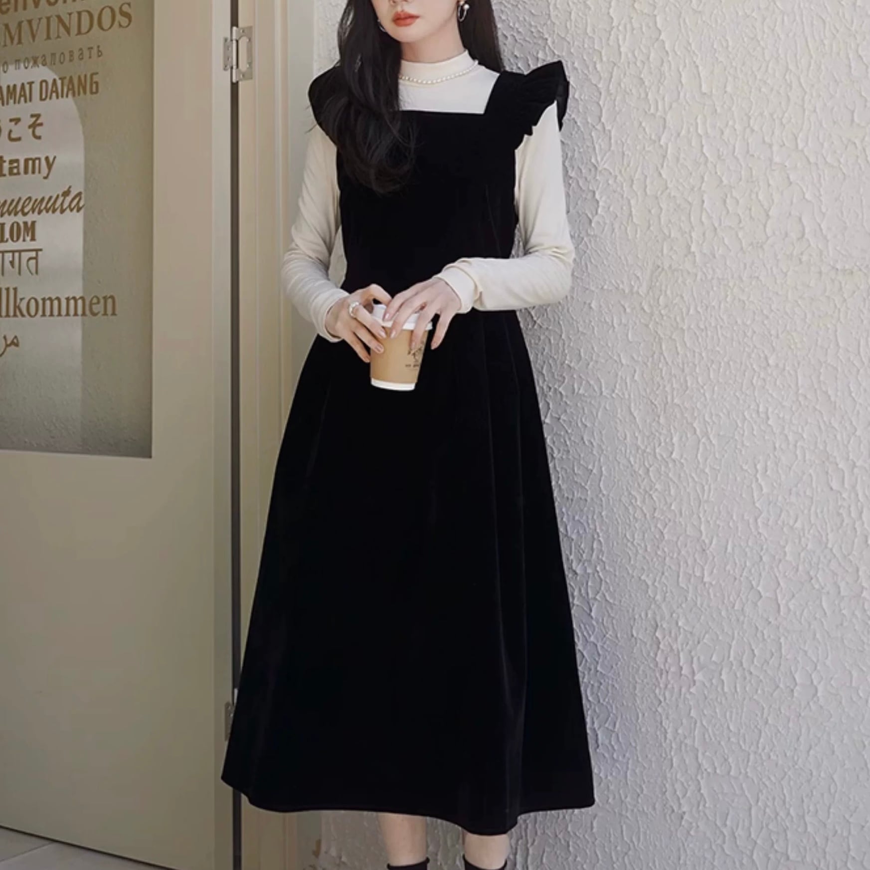 ブラックのベロア調ジャンスカにフリルをプラス。