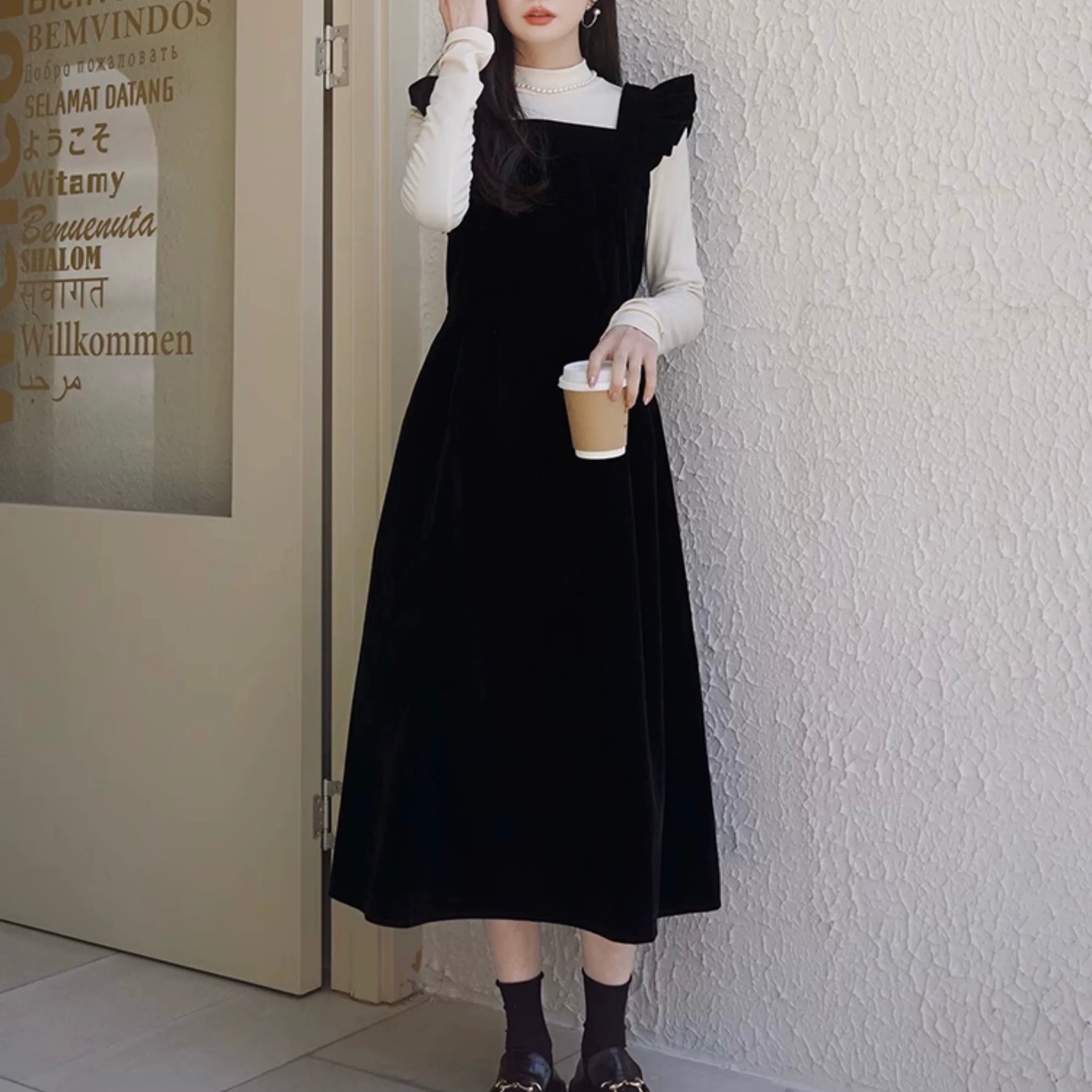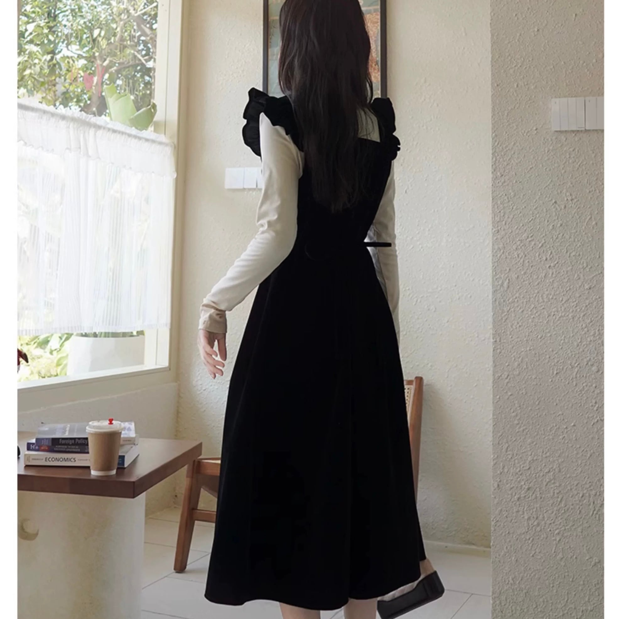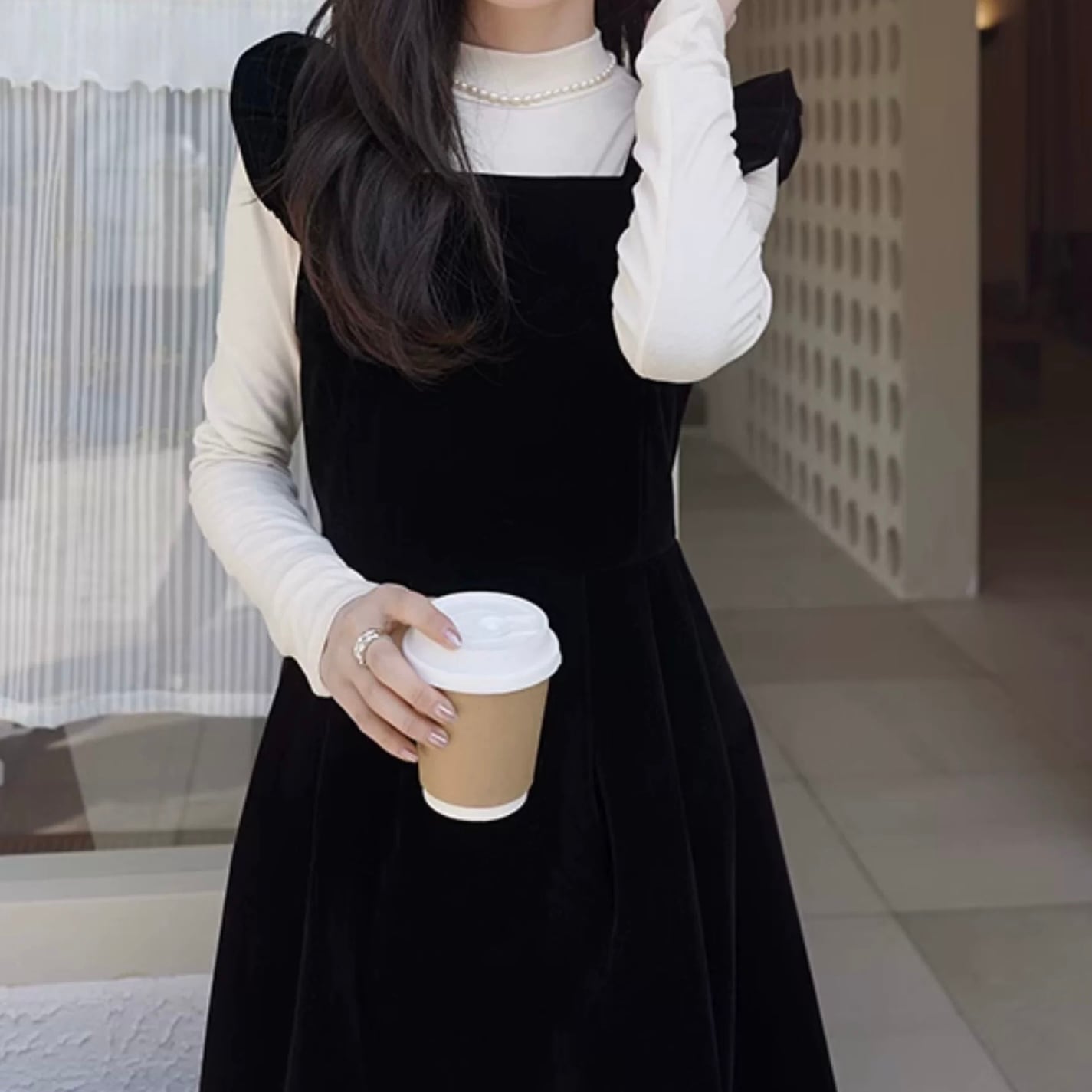 ブラックのベロア調ジャンスカにフリルをプラス。