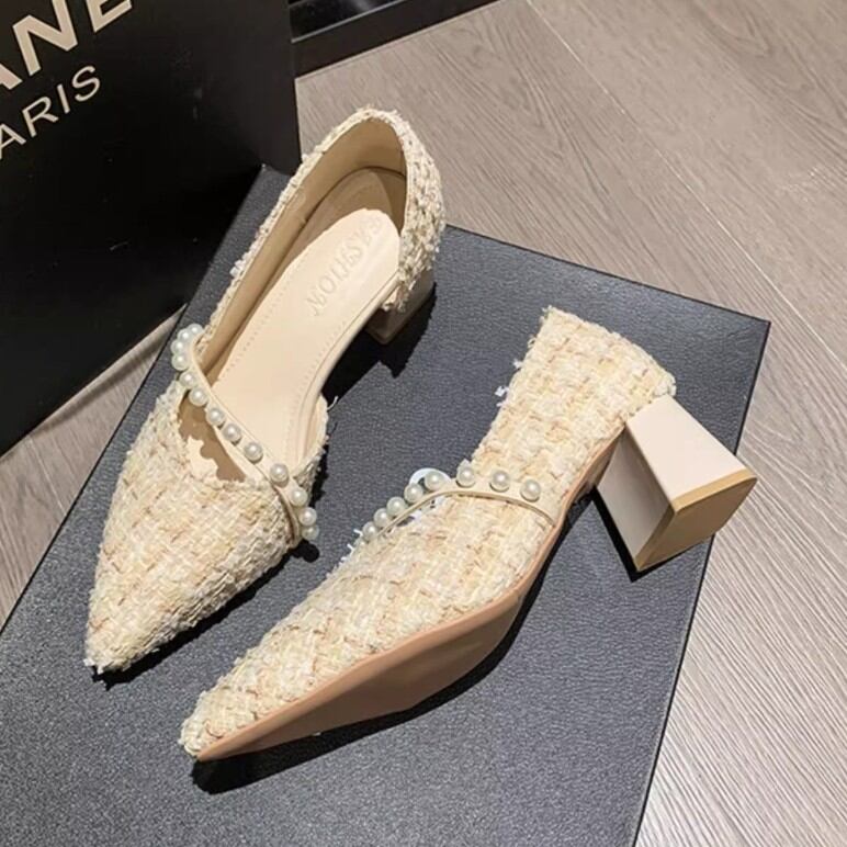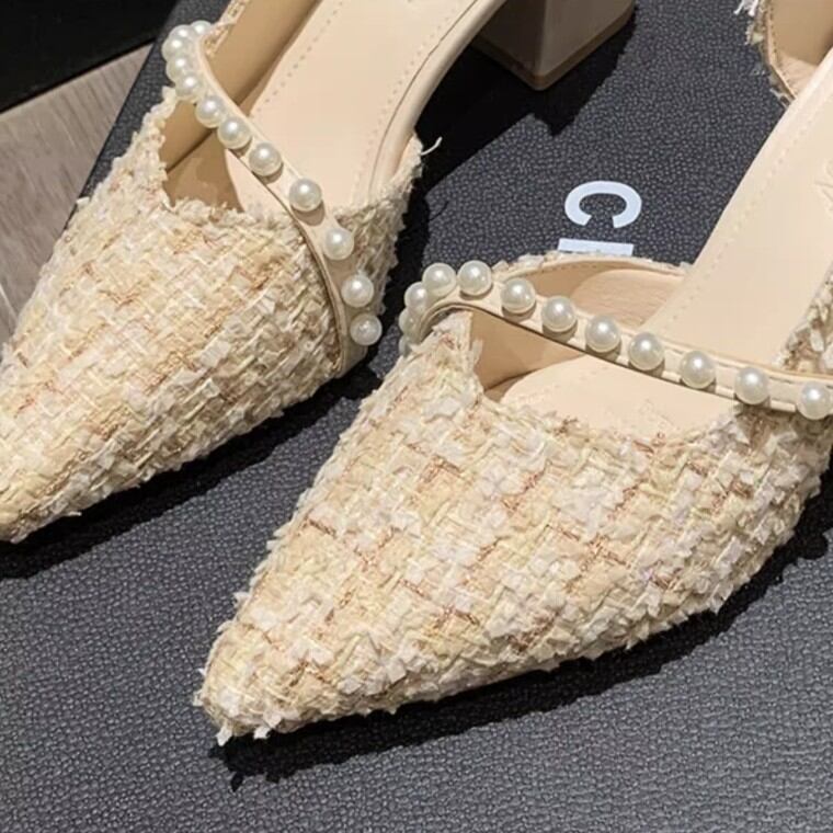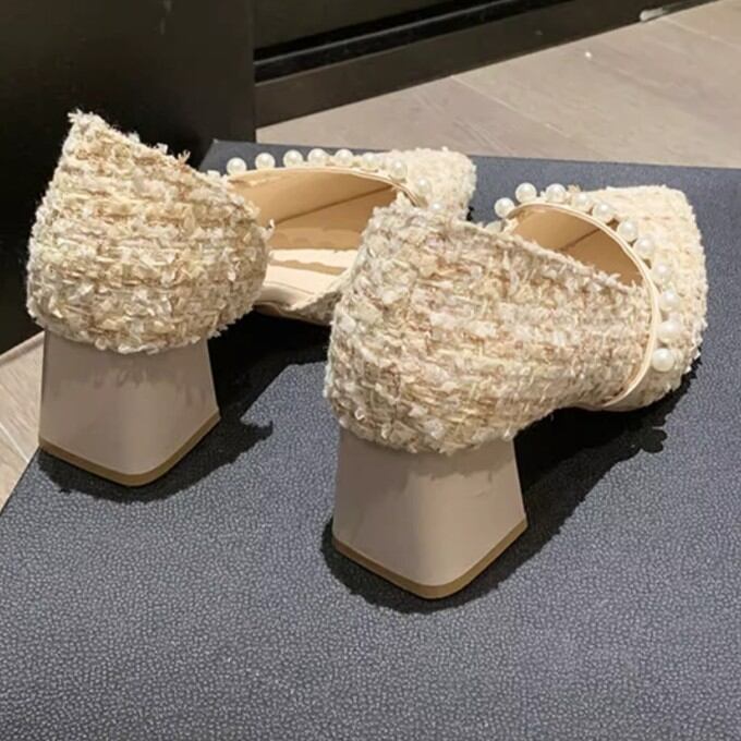 クラシカルなツイード素材と煌めくパールの組み合わせが華やか。
