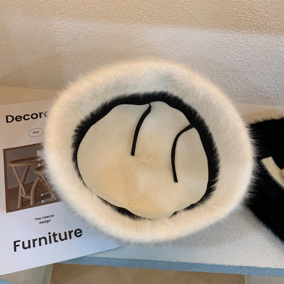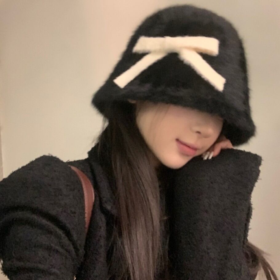 ふわふわとしたファー素材に大きめリボンがアクセントのバケットハット。