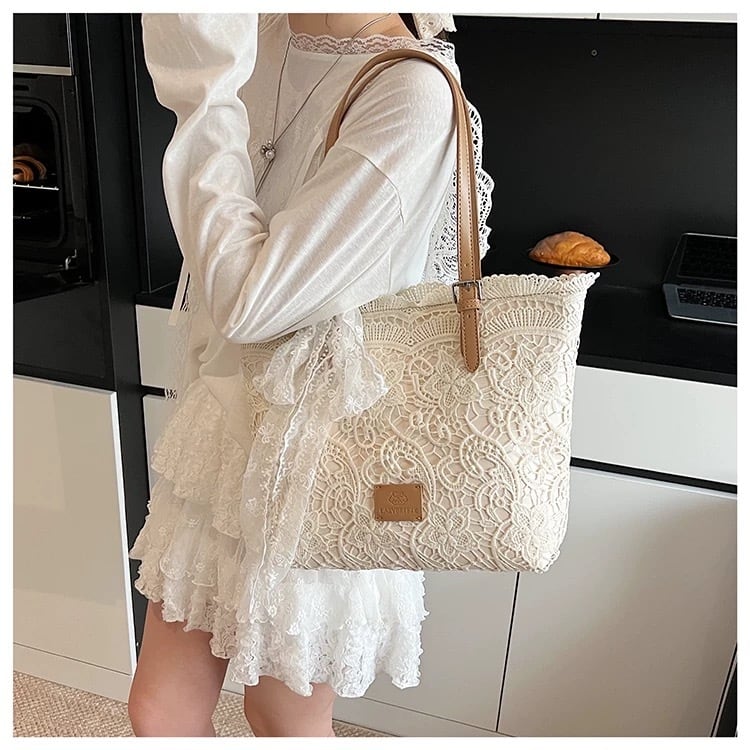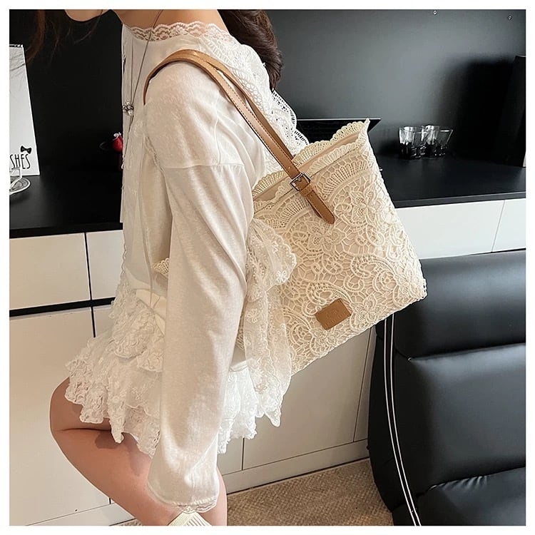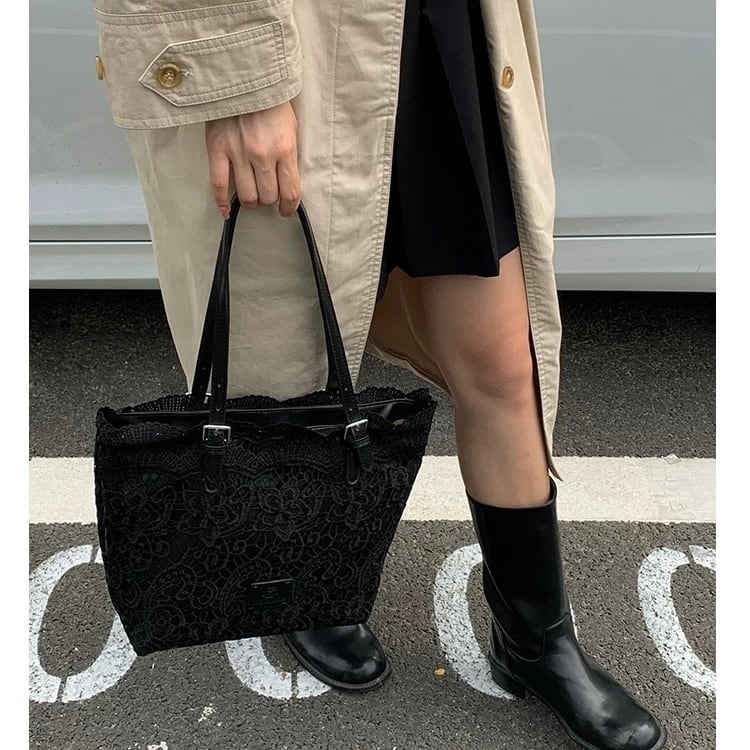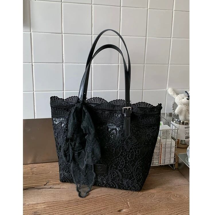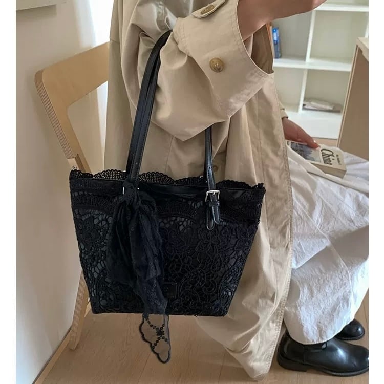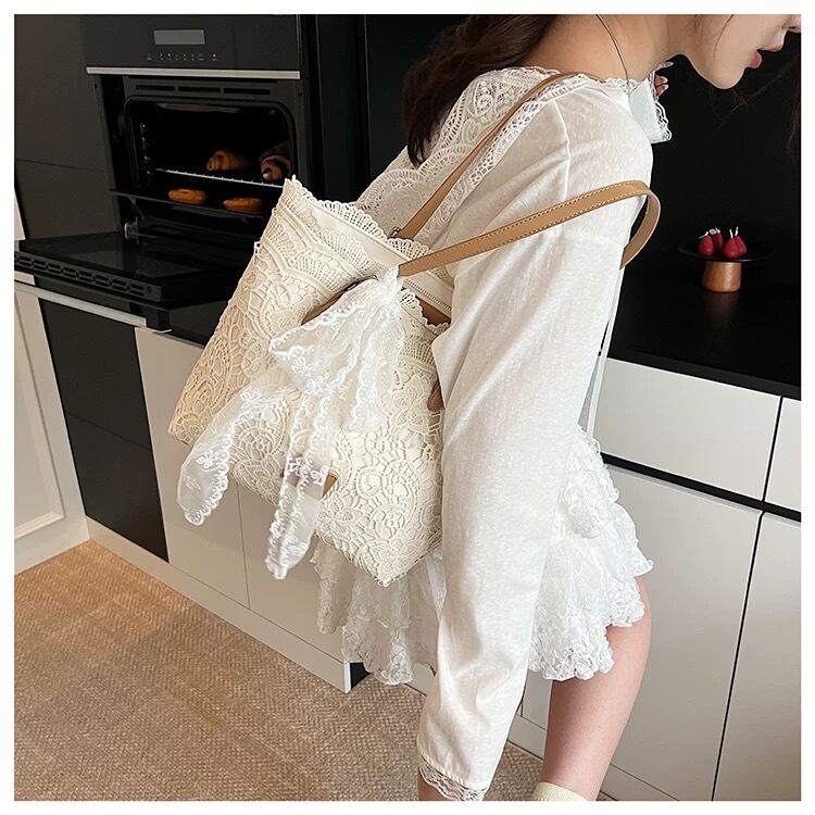 繊細なレースデザインに大きなリボンを添えた華やかなトートバッグ。