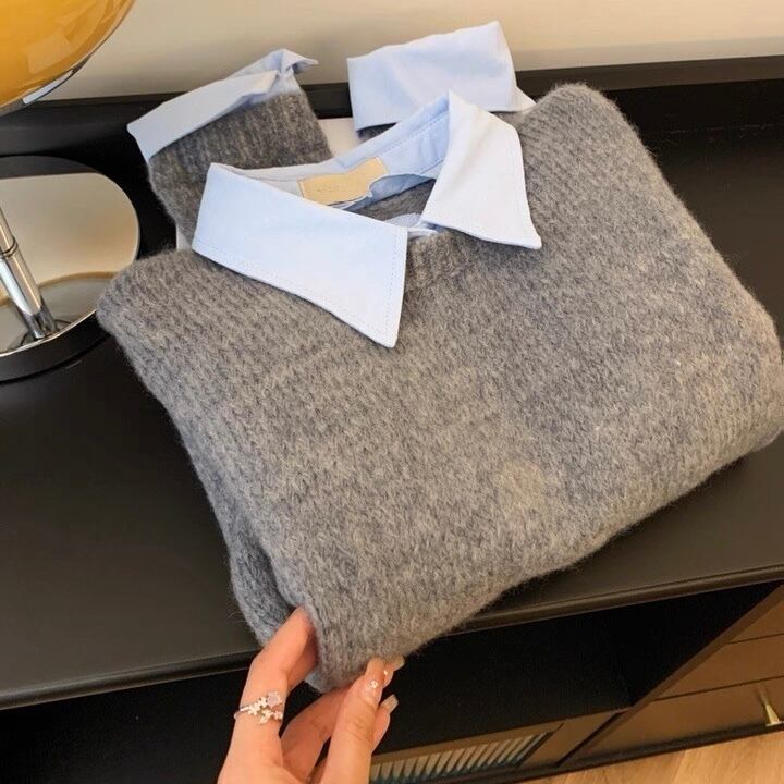 ブルーシャツを重ね着したようなデザインが特徴のグレーニット。
