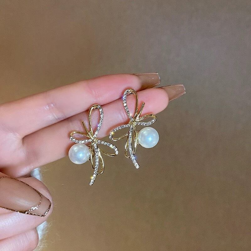 煌めくストーンで描かれたリボンモチーフに、上品な一粒パールをあしらったイヤリング。