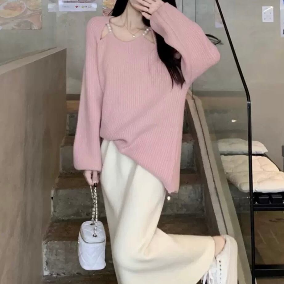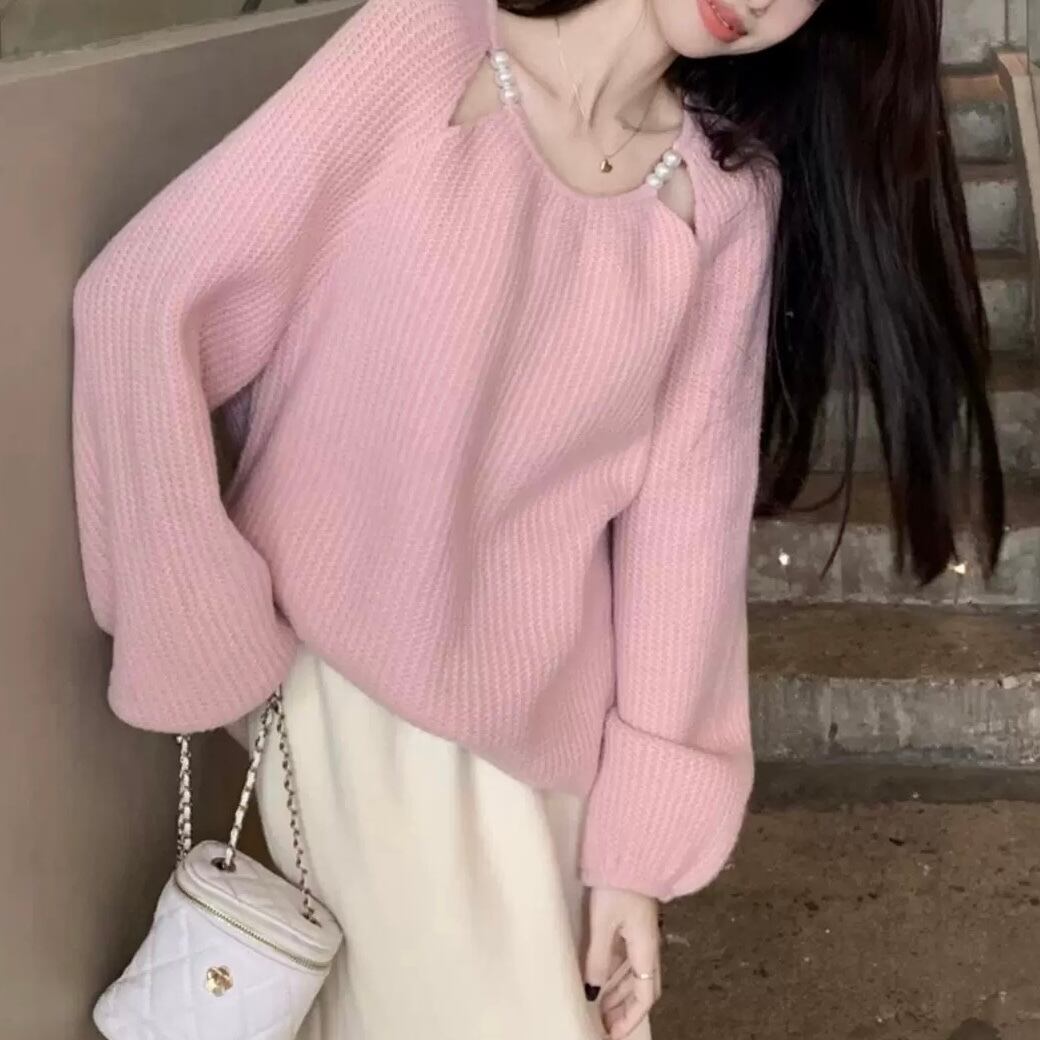 キュンと甘いピンクに、パールの肩デザインが乙女心をくすぐるニットトップス。