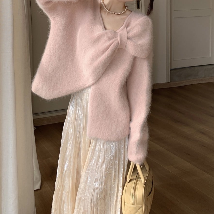 ふわふわのモヘア素材が愛らしいリボン付きニット。