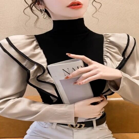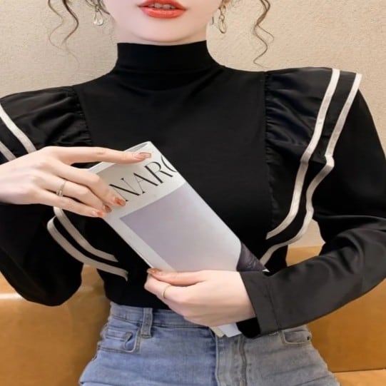 肩に施されたフリルラインが華やかなアクセントになるハイネックトップス。