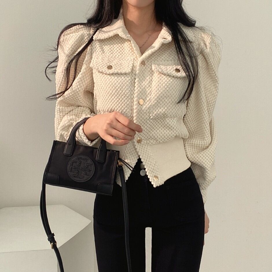 立体的な編み模様が印象的なショート丈ニットジャケット。