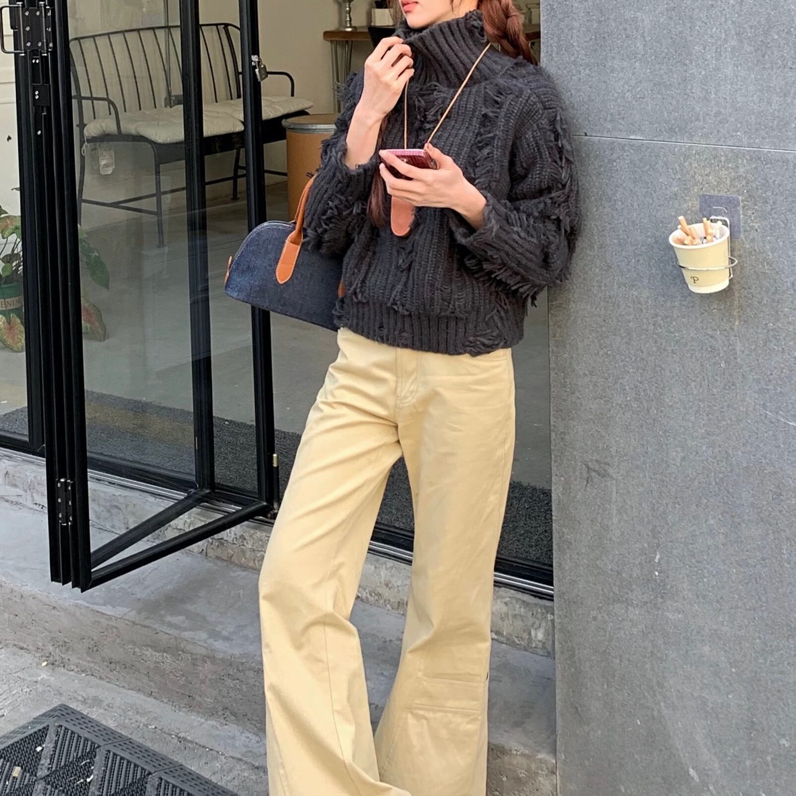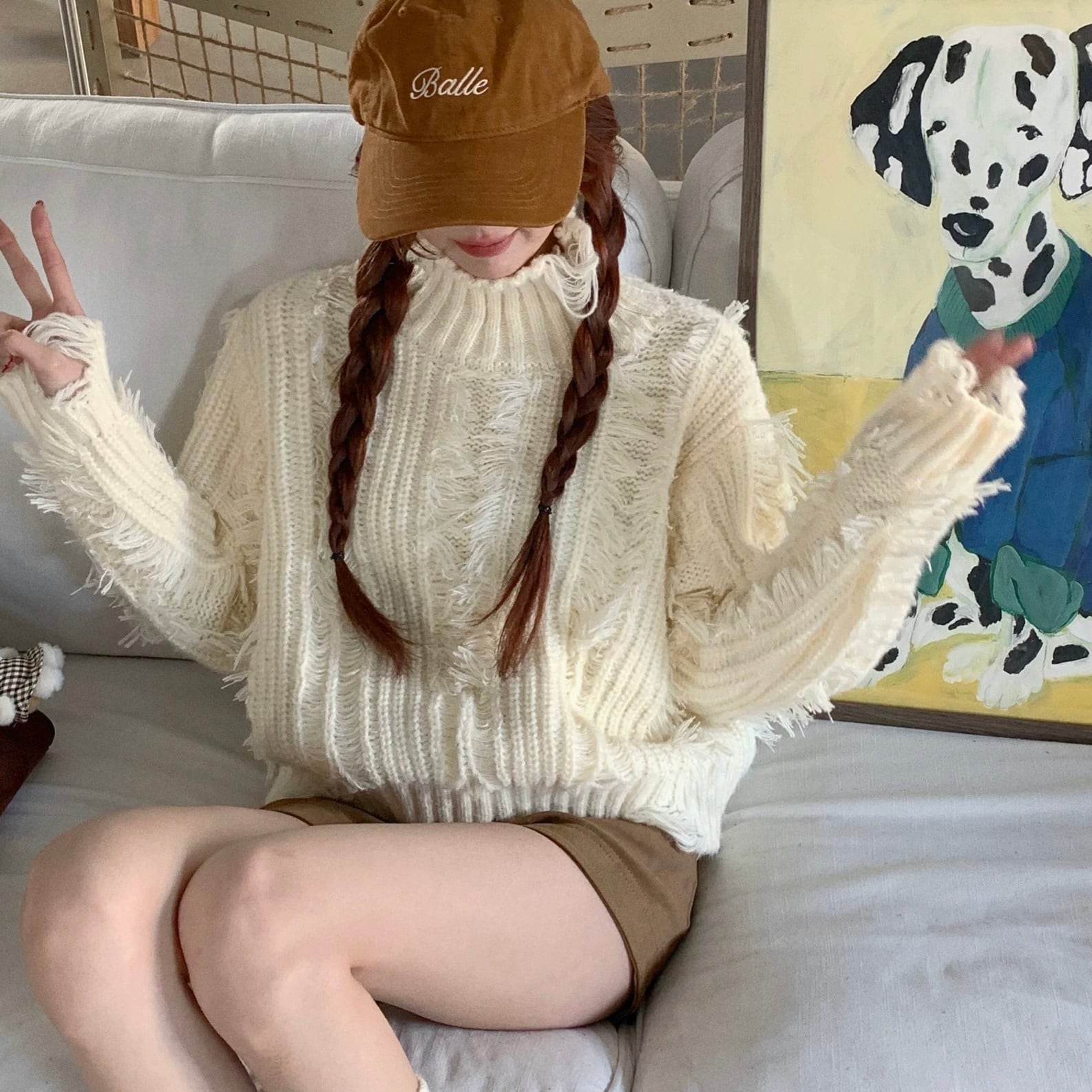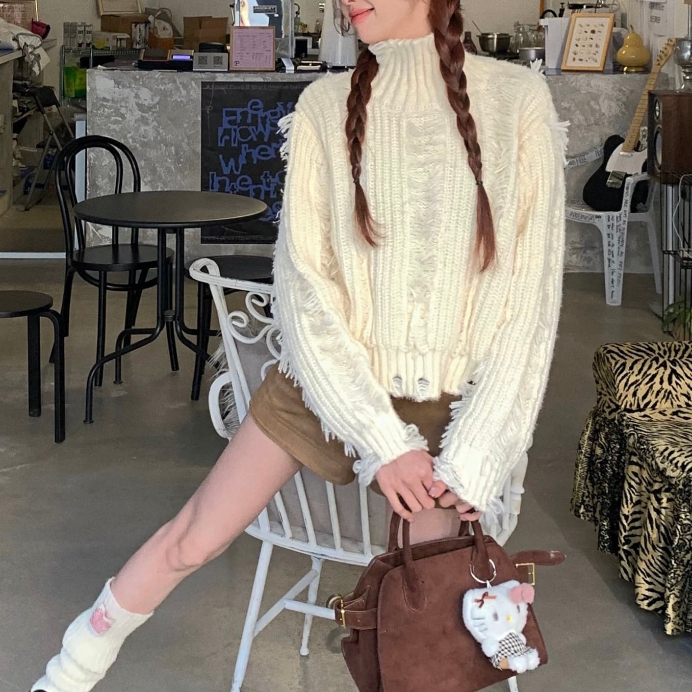 ショートパンツとの相性も抜群で、抜け感のある冬カフェスタイルに。