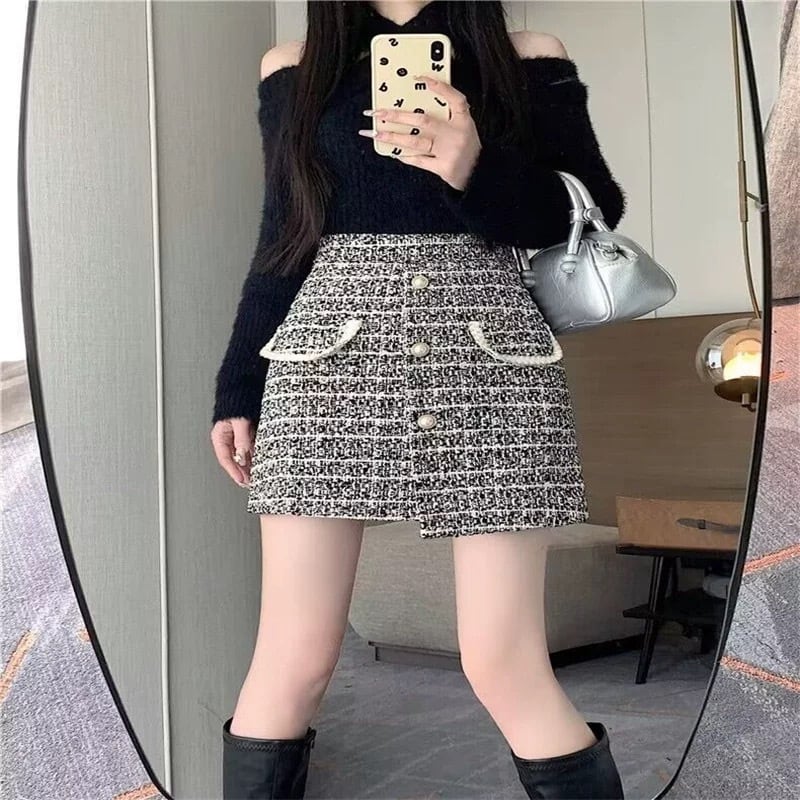 ツイードの華やかさと黒ニットの色気を両立した美人見えセット。