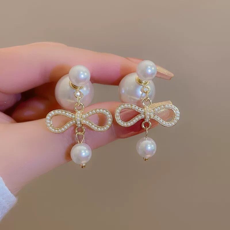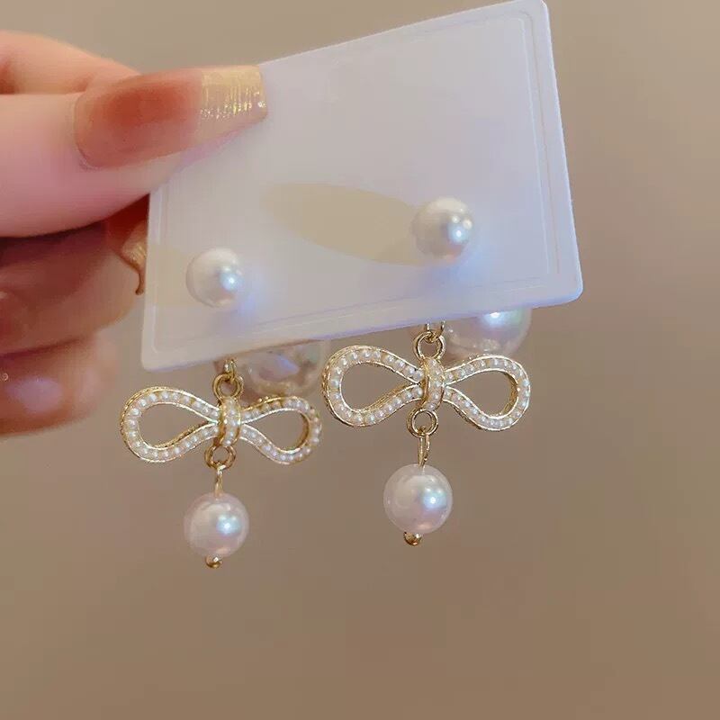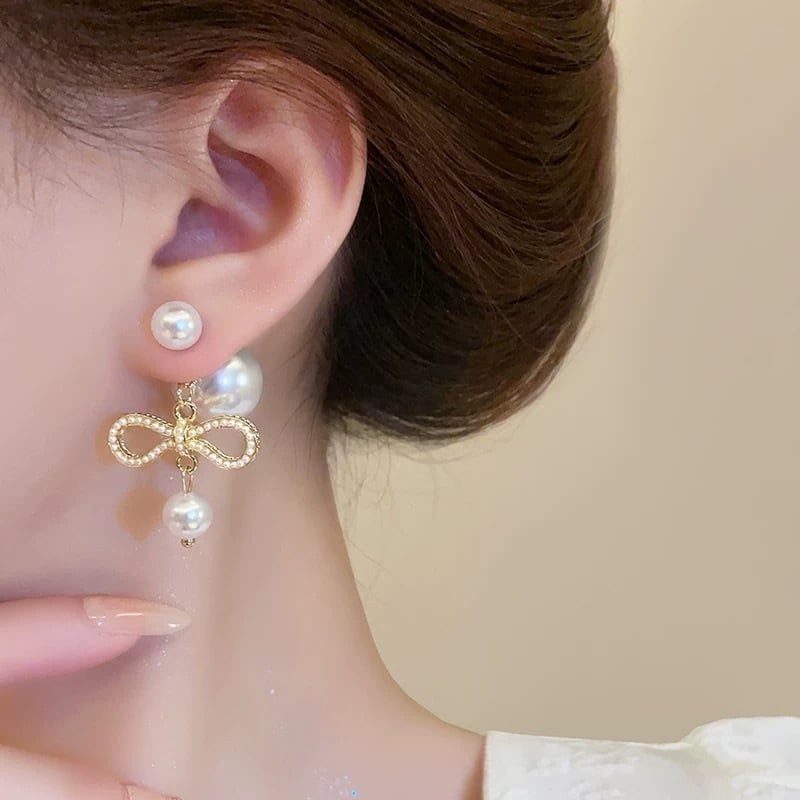 繊細な透かし模様のリボンとパールが揺れる、クラシカルで大人ガーリーなデザイン。