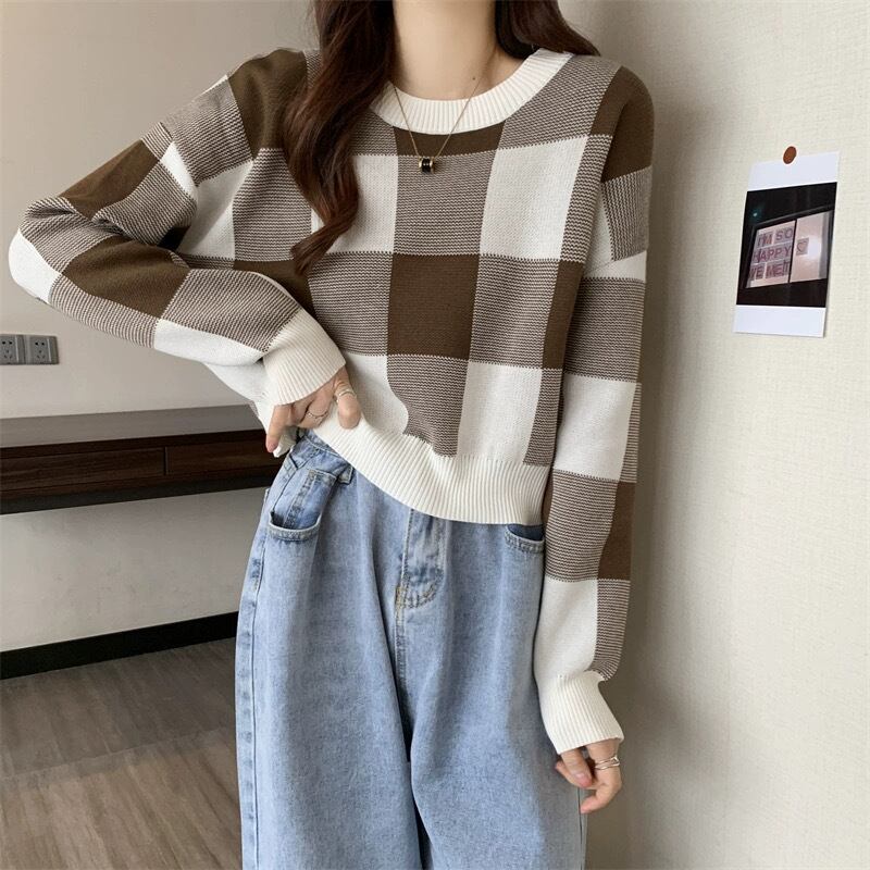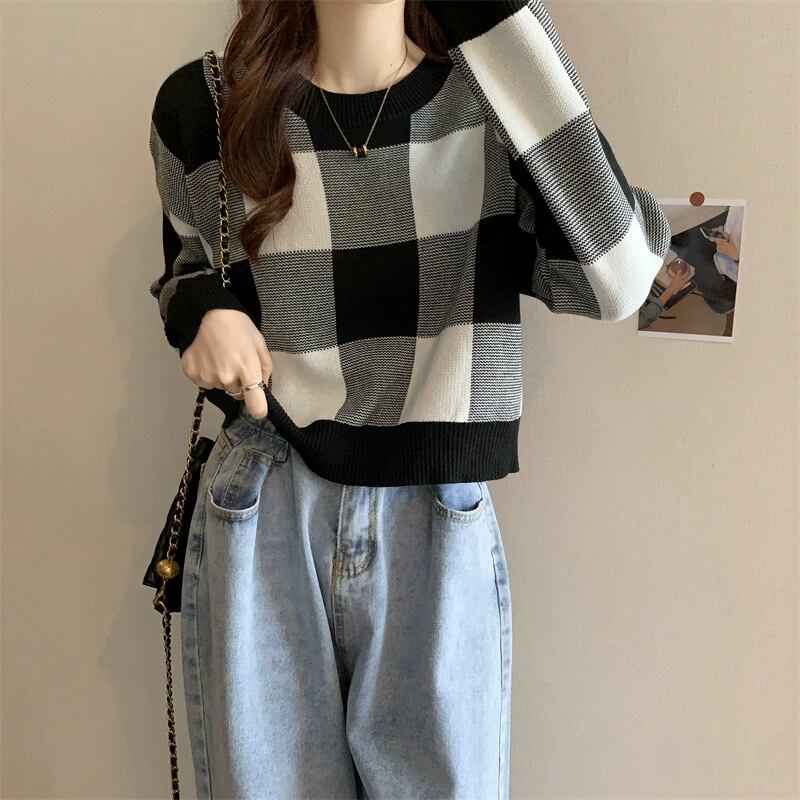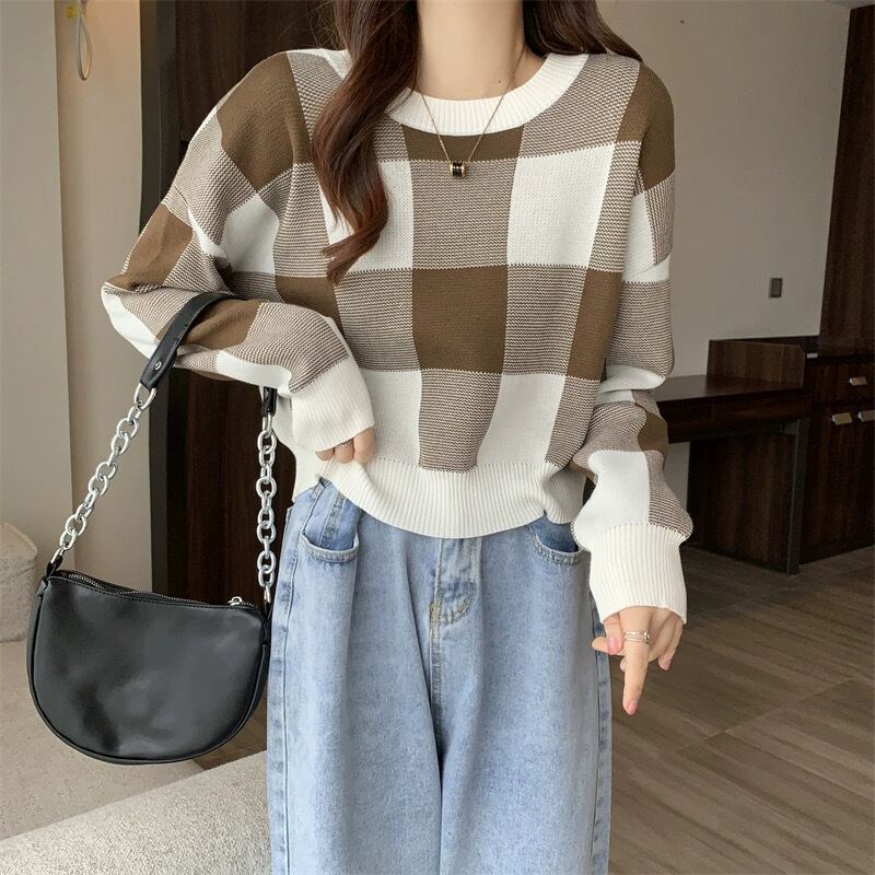 大きめのチェック柄が目を惹く、ゆったりシルエットのニット。
