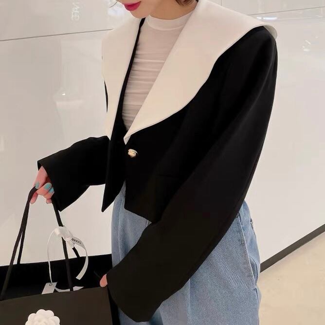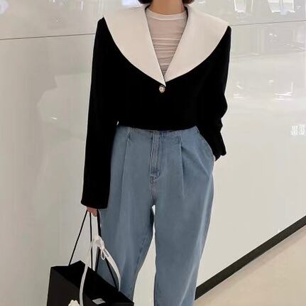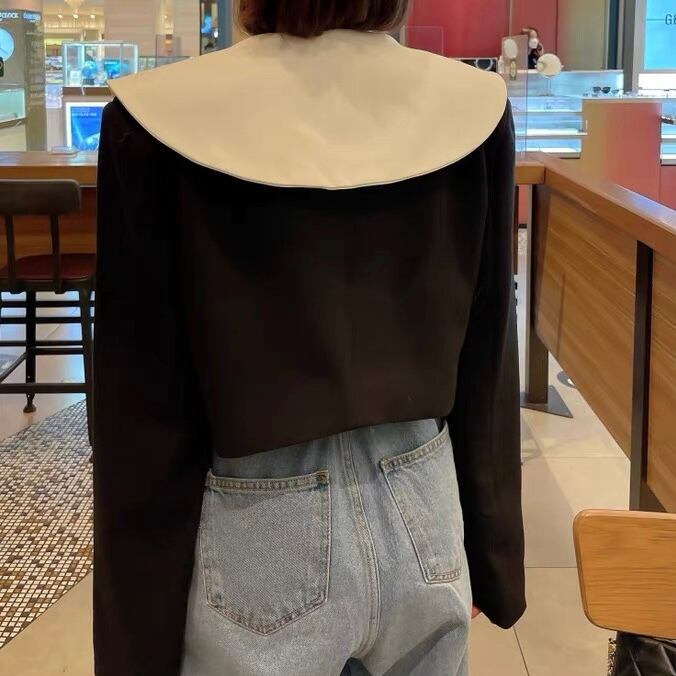 大きなホワイトカラーが目を惹くモードなショートジャケット。