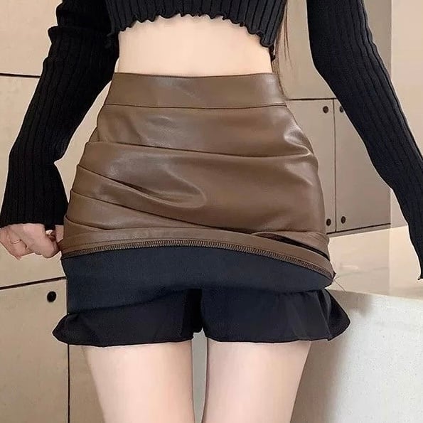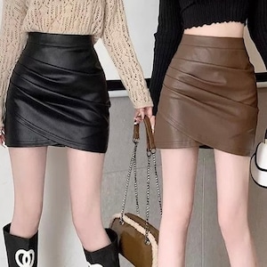 ボディラインを引き立てるレザー調ミニスカート。