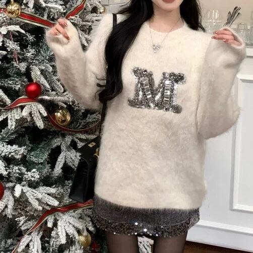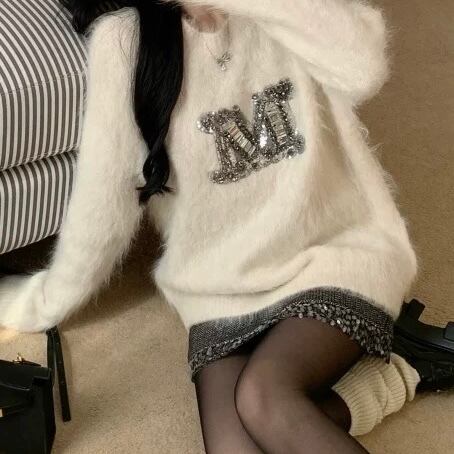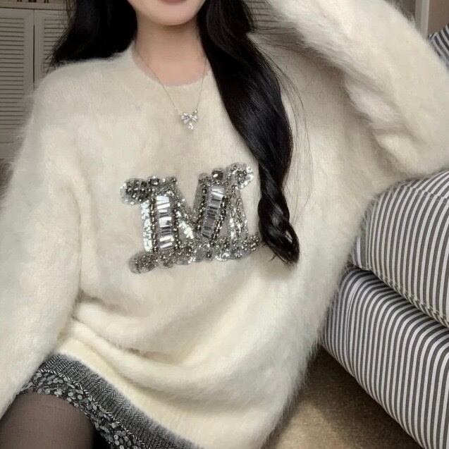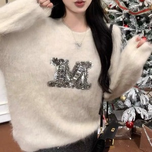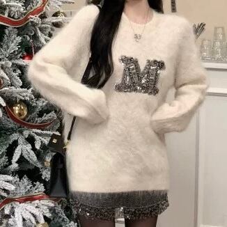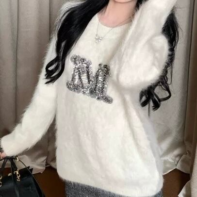 ふわっとしたフェザーニットに、煌めくイニシャルモチーフをあしらった華やかトップス。