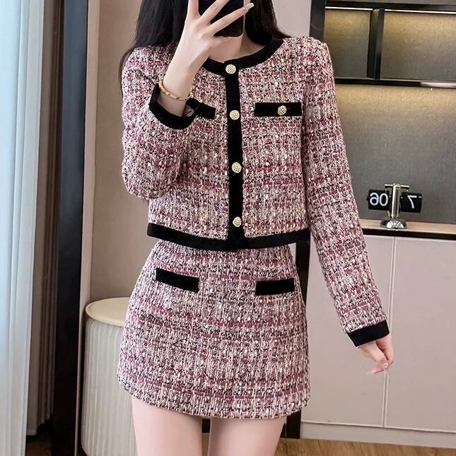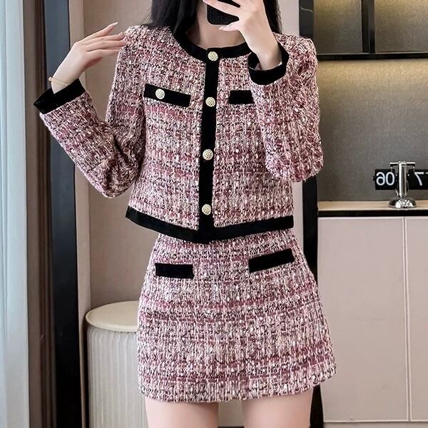 上品さと華やかさを両立する王道ツイードセットアップ。