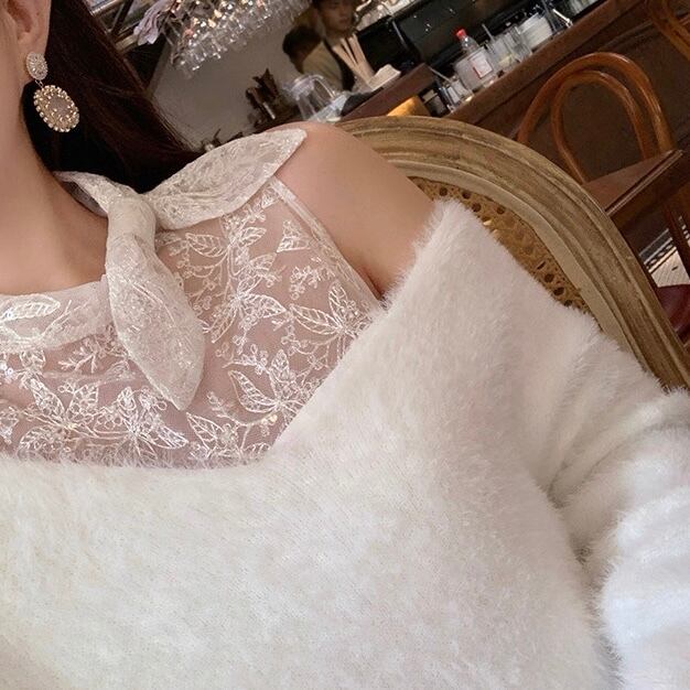 上品なレースとふわふわニットが重なる、冬のお嬢様コーデにぴったりの一枚。